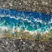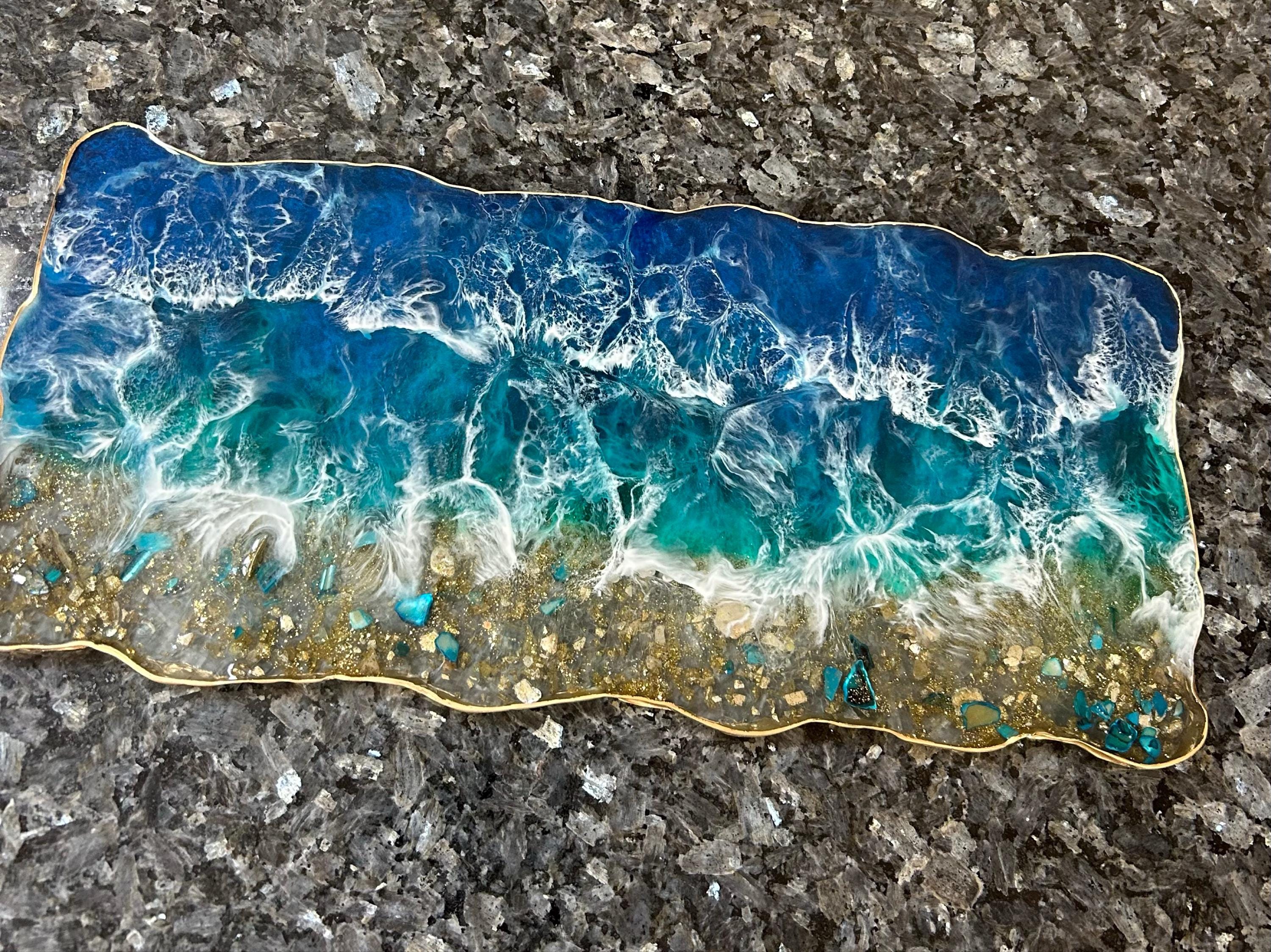Stunning beach theme décor! no 2 trays will be exact. All my resin art is handmade, this tray is approx. 11X7 and has a beautiful ocean and waves color combo resin tray, with hundreds of individually placed pieces of mirrored glass, stones and metal glitters that mimic the sandy shores. giving it a beautiful look. It has amazing brilliance and sparkle that can not be captured in pictures. The handle are crystal like acrylic, for a glass look with brass tones. Please note the tray is made with real tempered glass and can have sharp edges.
